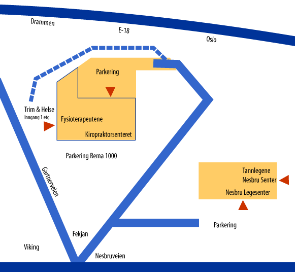 Her er inngangen til Nesbru Trim&Helse Her finner du Nesbru Fysioterapå AS Her ligger Kioropraktorsenteret AS Her ligger Tannlegene Nesbru Senter Her er inngangen til Nesbru Legesenter